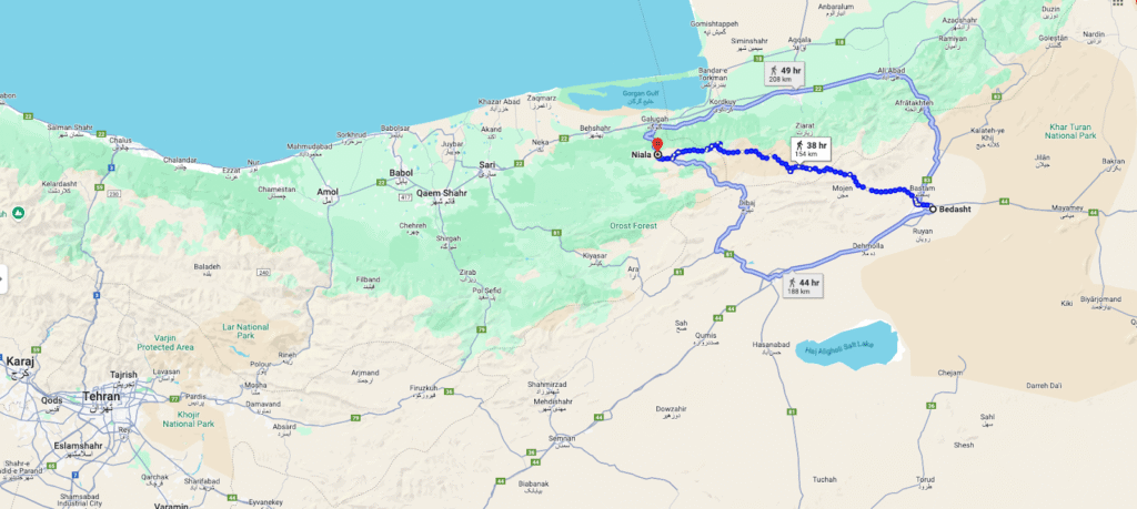 Approximate route of BábĂ caravan from Badasht [outside Sháh-RĂşd, Semnán province] to NĂyálá [just across the border into Mazindaran province]. The capital Tihrán is on bottom left corner. From google maps. Modern spelling of towns and cities in map differ from the spelling used in Dawn-Breakers text e.g. Simnán/Semnan; Tihrán/Teheran; Badasht/Bedasht; NĂyálá/Niala. 106ACT6