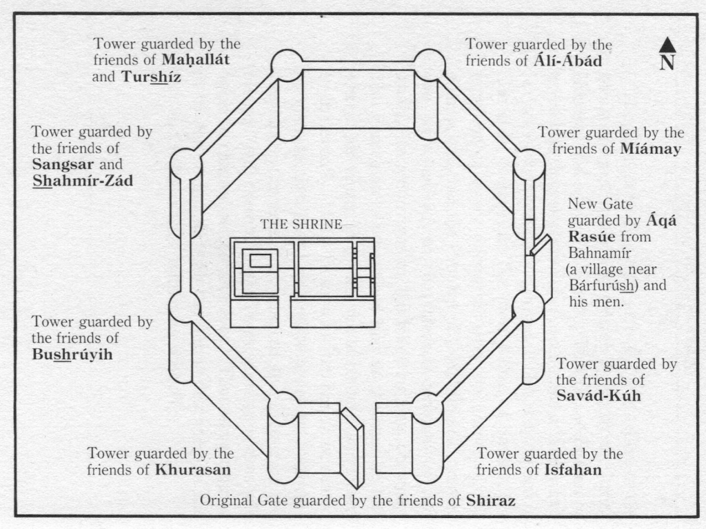 A rendering of the design of the Fort at Shaykh Tabarsí based on various historical sources. Also indicated are the posts assigned to different groups of companions. With the exception of the original shrine itself at the centre, all the fortifications were destroyed by the army when the siege ended. 98ACT8
