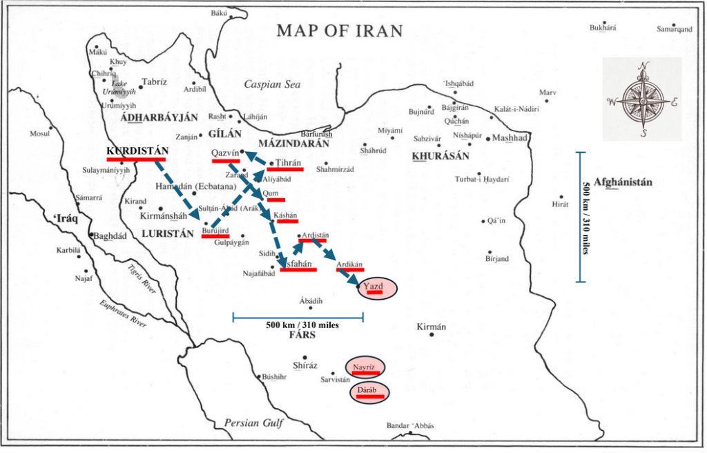 Vahíd’s travels in the latter half of 1849 and early 1850. He was teaching in Kurdistán, Burújird, and Tihrán, followed by Qazvín, Qum, Káshán, Isfáhán, Ardistán, Ardikán and eventually Yazd, where he arrived five days before Naw-Rúz of 1850. Route shown is an approximation as details are not known. Also highlighted on the map are the locations of Vahíd’s three residences: Yazd, Nayríz and Dáráb. Note that only certain provinces are identified on this map. The town of Yazd is in the province with the same name [Yazd], while Nayríz and Dáráb, like Shíráz, are in the province of Fárs. 10_ACT11