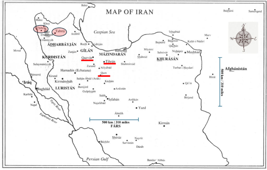 Map of Írán highlighting Chihríq, Tabríz, Qazvín, Qum and Tihrán. Mullá Baqir takes the sealed documents, ring and seals of the Báb from Chihríq to Qazvín to Qum to Mírzá Ahmad, who then takes them to Bahá’u’lláh in Tihrán. The Báb Himself is taken from Chihríq to Tabríz. 8_ACT13