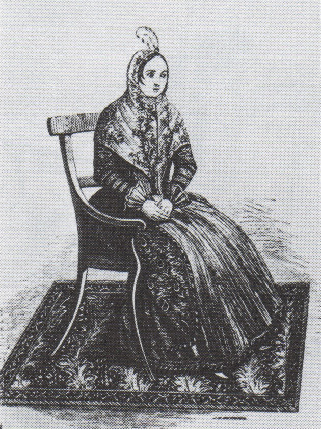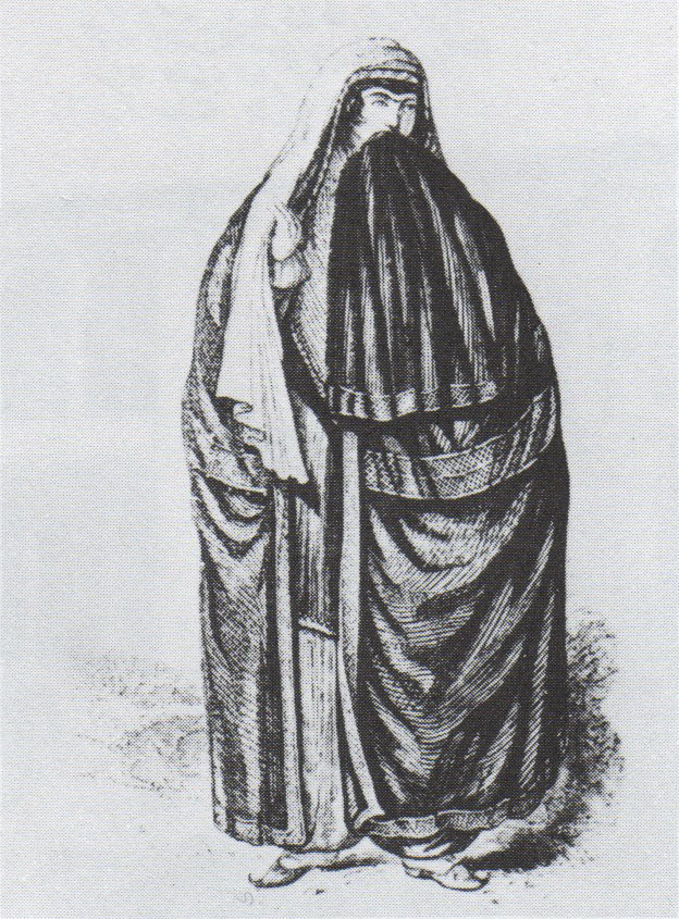 Outdoor (top) and indoor (bottom) dress of Persian ladies in mid-nineteenth century. The women’s faces would typically be fully veiled [veils not shown in these drawings]. Archival drawings. 75_ACT15