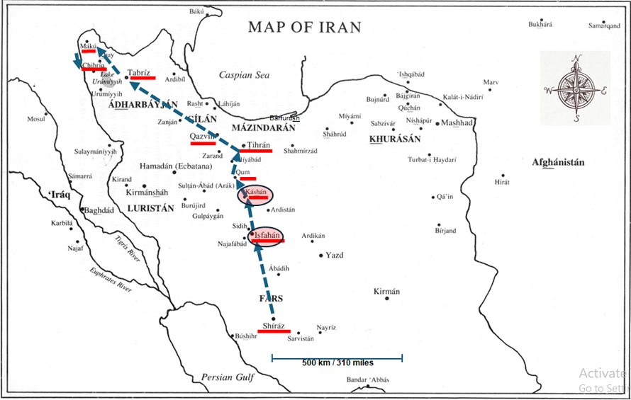 The Báb’s travel from 1846 to 1848. Route outlined is an approximation as details of all stops are not known. From the city of Isfáhán He was escorted to the city of Káshán, en route to the capital city, Tihrán. 74ACT5