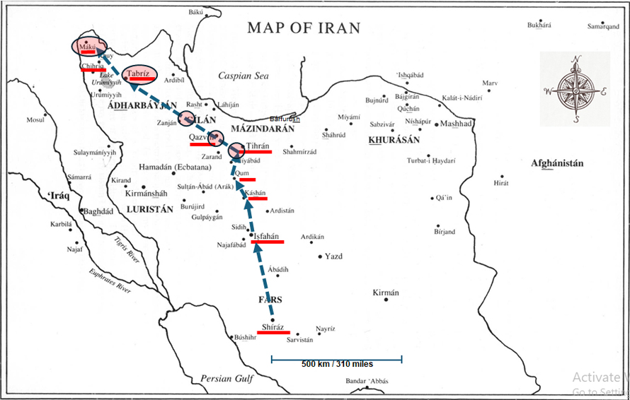 The Báb’s travel from 1846 to 1848. Route outlined is an approximation as details of all stops are not known. The main route from Tihrán to Tabríz goes through two major cities, Qazvín and Zanján. The Báb, not being allowed into any of the major towns, only stayed in villages on the outskirts of these cities until they reached Tabríz [East Ádhirbáyján province] and from there sent to prison, first to Máh-Ku for nine months [West Ádhirbáyján province]. 102ACT5